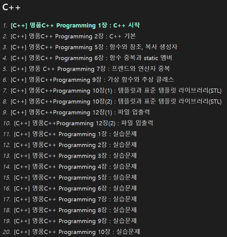 저는 책의 개념을 익히 것을 포스팅, 예제를 문제를 풀고 난 뒤 포스팅하여 제가 C++ 기초를 공부했다는 걸 증명식으로 공부했습니다.