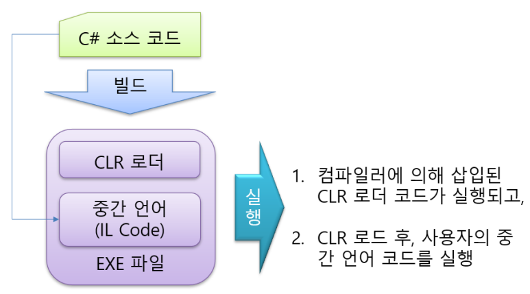 C# 입장에서 닷넷 프레임워크를 설명하면, C# 컴파일러는 소스코드를 기계어가 아닌 IL(Intermediate Language)이라고 하는 중간 언어로 EXE/DLL 파일 내부에 생성한다. 또한 프로그램이 시작하자마자 CLR을 로드하는 코들르 자동으로 EXE 파일 내부에 추가한다. 따라서 사용자 C#으로 개발된 애플리케이션을 실행하면 내부적으로 CLR이 먼저 로드된다. 이어 CLR은 EXE 파일 내에 있는 중간 언어 코드를 로드해서 본격적인 실행 단계에 들어선다.