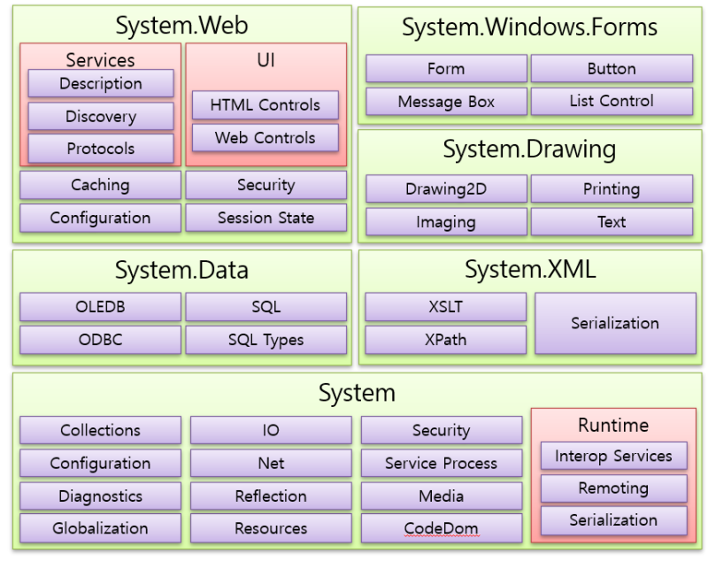 즉 "닷넷 프레임워크 = CLR + 부가 구성 요소"라고 간단히 정의할 수 있고, 여기서 구성 요소에는 다음과 같은 것이 포함된다.