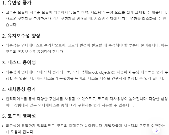즉, Class를 직접 참조하는 것이 아니라 그 대상의 상위 요소(추상 클래스 or 인터페이스)로 참조하라는 원칙입니다.