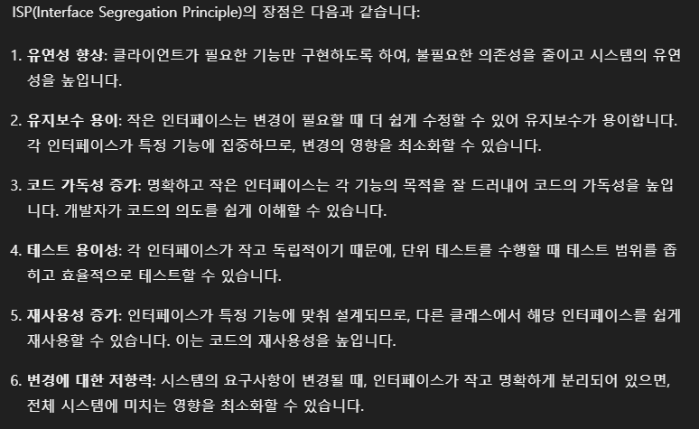 이처럼 위에 배운 OCP가 잘 적용되어야 ISP 원칙에 위배되지 않을 수 있습니다.