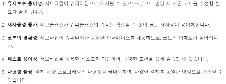 즉, 자식 클래스는 부모 클래스의 기능을 대체할 수 있어야 하며, 부모 클래스의 객체를 사용하는 코드에서 자식 클래스의 객체를 사용해도 문제가 없어야 합니다.