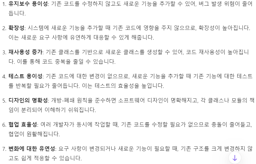 즉, 기존의 코드를 수정하지 않고 새로운 기능을 추가할 수 있어야 한다는 것 입니다.