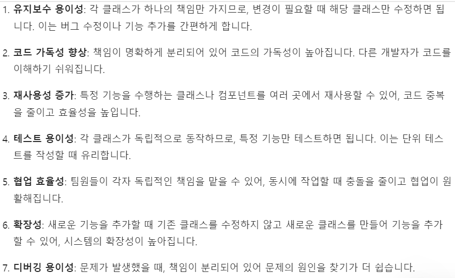 즉, 클래스는 하나의 기능이나 목적에 집중해야 하며, 이로 인해 유지보수성과 확장성이 향상됩니다.