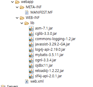 ojdbc()와 mybatis jar파일 다운 (mybatis -3.5.11.zip안에 있다. ojdbc는 oracle사이트에서 다운로드)- 3 라이브러리 업로드,로깅(=기록하다) 설정 (mybatis는 sql exception 발생하지 않음 )