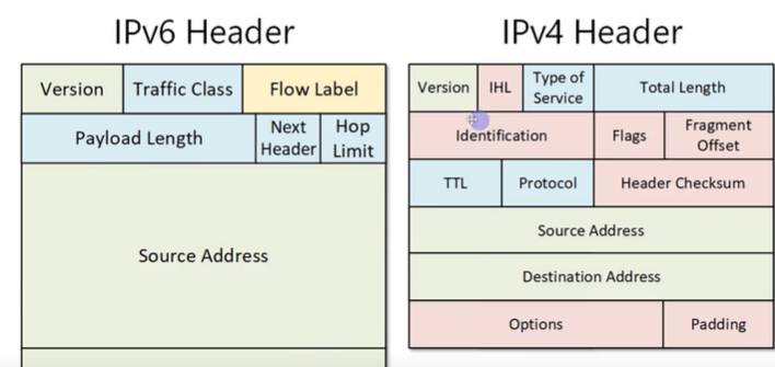 IPv4는 가변 길이 옵션 필드가 있어 20바이트에서 헤더 길이가 달라진다. 그러나 IPv6는 확장 헤더라는 다른 헤더로 분리하여 IP 페이로드 앞에 배치함으로써 헤더 길이를 40바이트로 고정하고 있다.