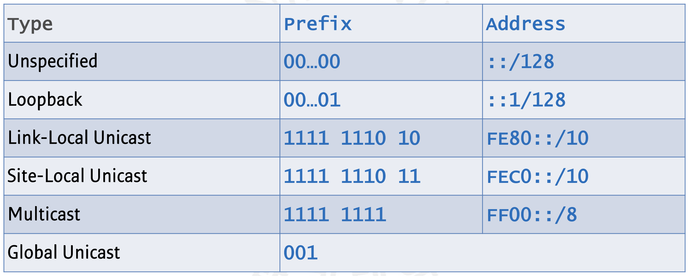 1:1 통신에서 사용하는 IPv6 주소이다. 웹, 메일 통신의 경우에 해당한다. 이 중에서도 특별한 역할을 하는 주소들이 정의 되어 있는데,