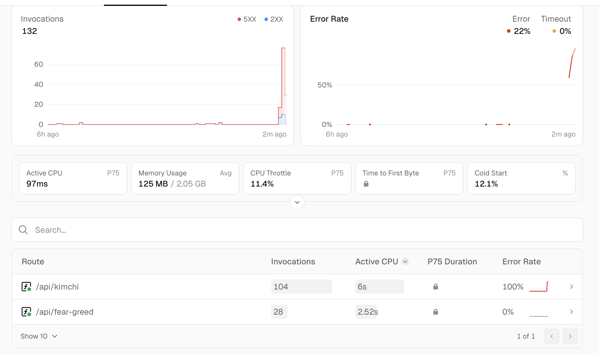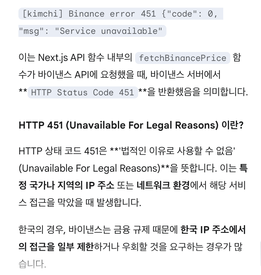 Binance API를 호출할 때, Next.js API Route가 Vercel의 서울(icn1) 리전에서 실행되면서 해당 리전의 IP 주소가 바이낸스의 지역 차단 목록에 포함되었을 가능성이 매우 높다고 생각한다.