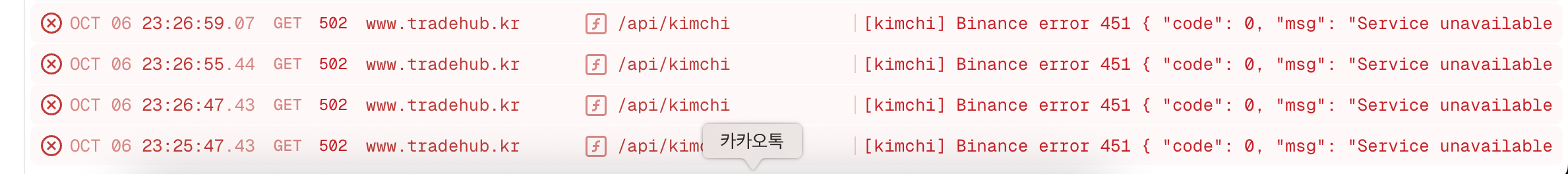 에러 로그를 보니깐 바이낸스 측에서 451를 반환하고 있었고