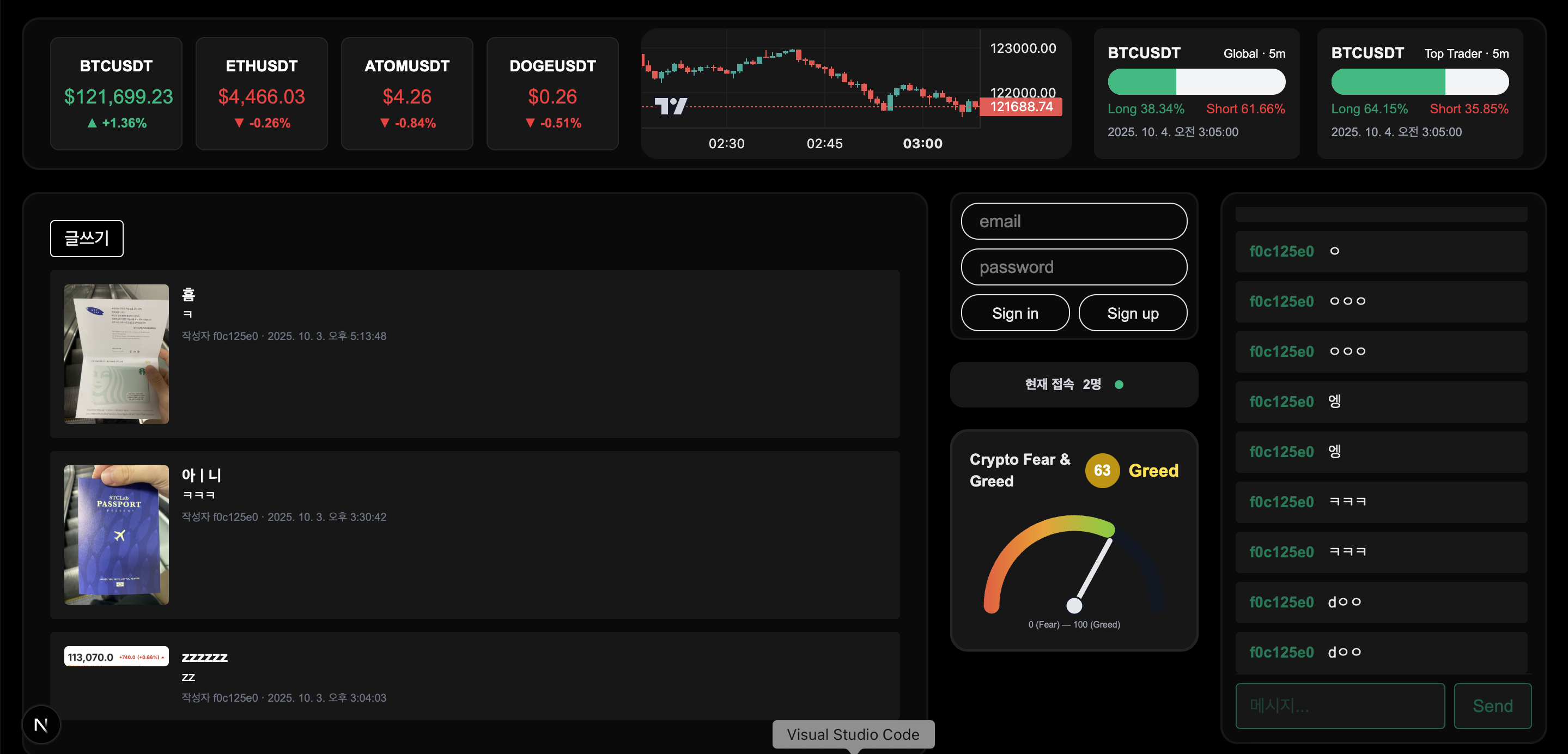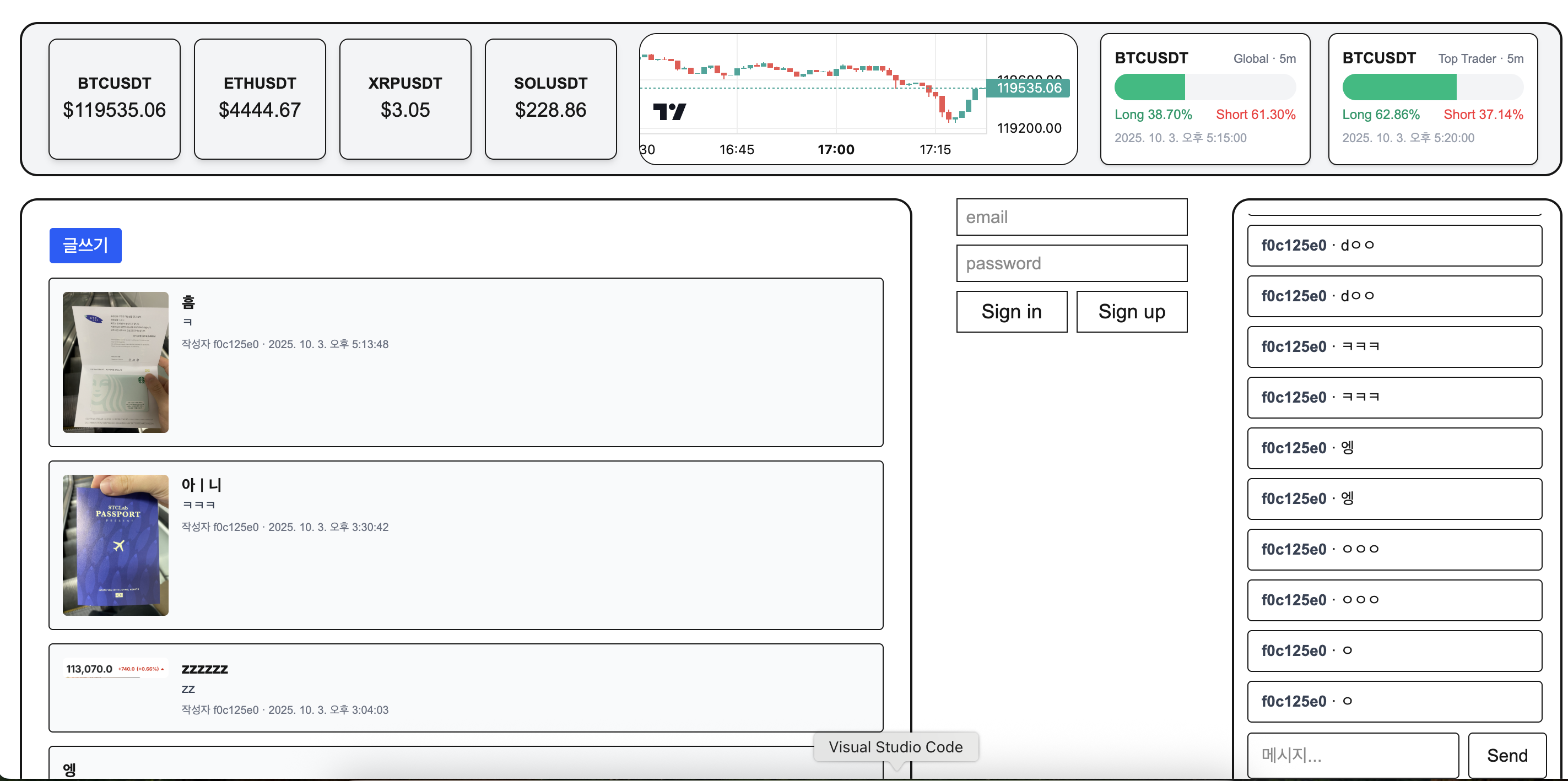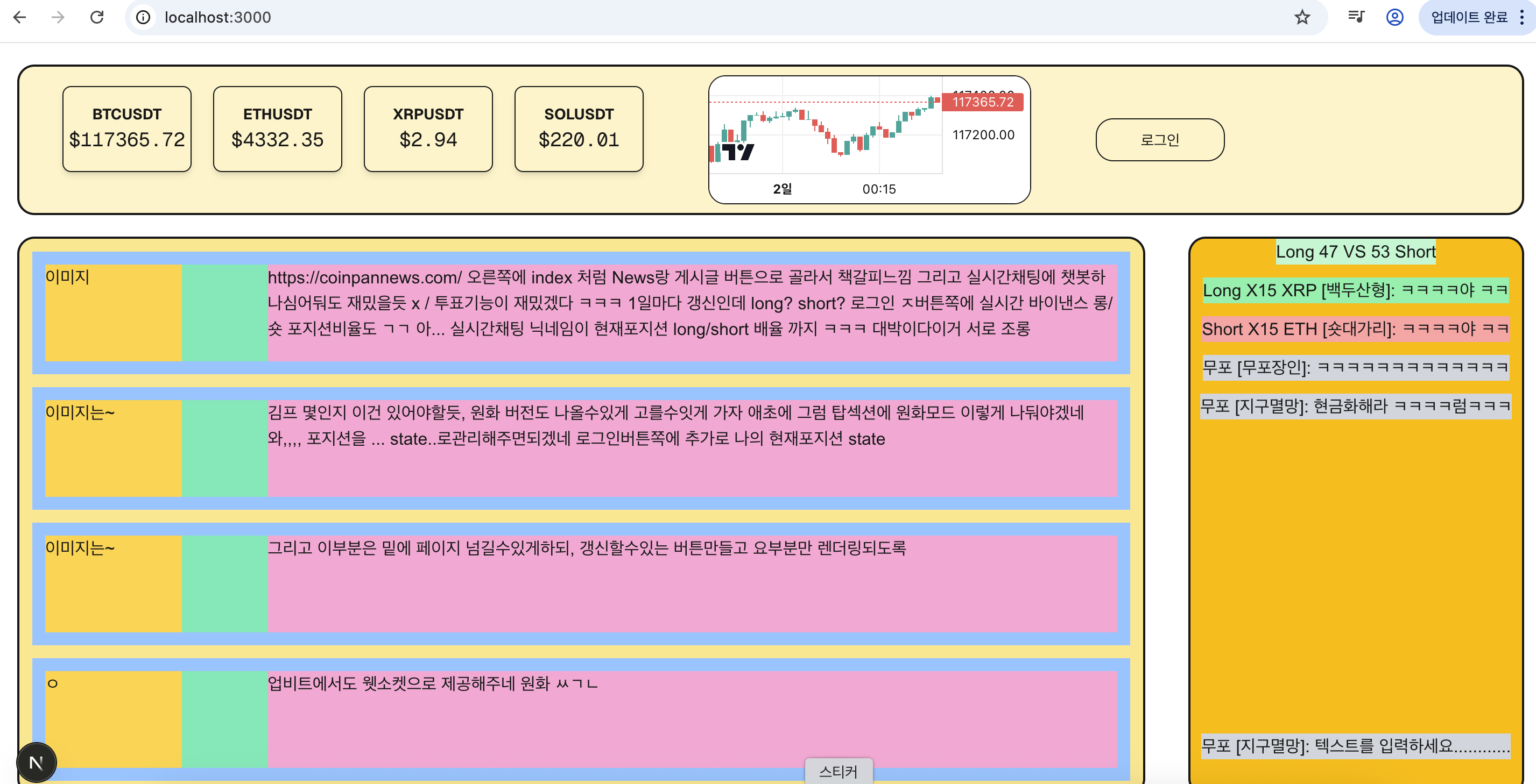 그리고 커뮤니티 탭에는 코인 뉴스 스크래핑 목록이랑