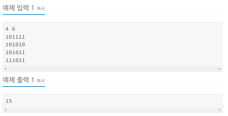 첫째 줄에 두 정수 N, M(2 ≤ N, M ≤ 100)이 주어진다. 다음 N개의 줄에는 M개의 정수로 미로가 주어진다. 각각의 수들은 붙어서 입력으로 주어진다.