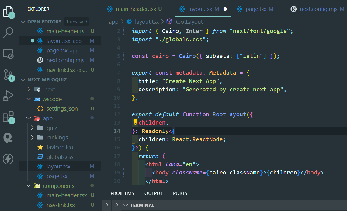 모든 페이지에서 글꼴을 사용하려면 아래와 같이 app 폴더 아래에 layout.tsx 파일에 추가하면 된다. 나는 TypeScript를 사용하기 때문에 tsx 파일일뿐 루트에 위치한 layout 파일에 추가하면 된다.