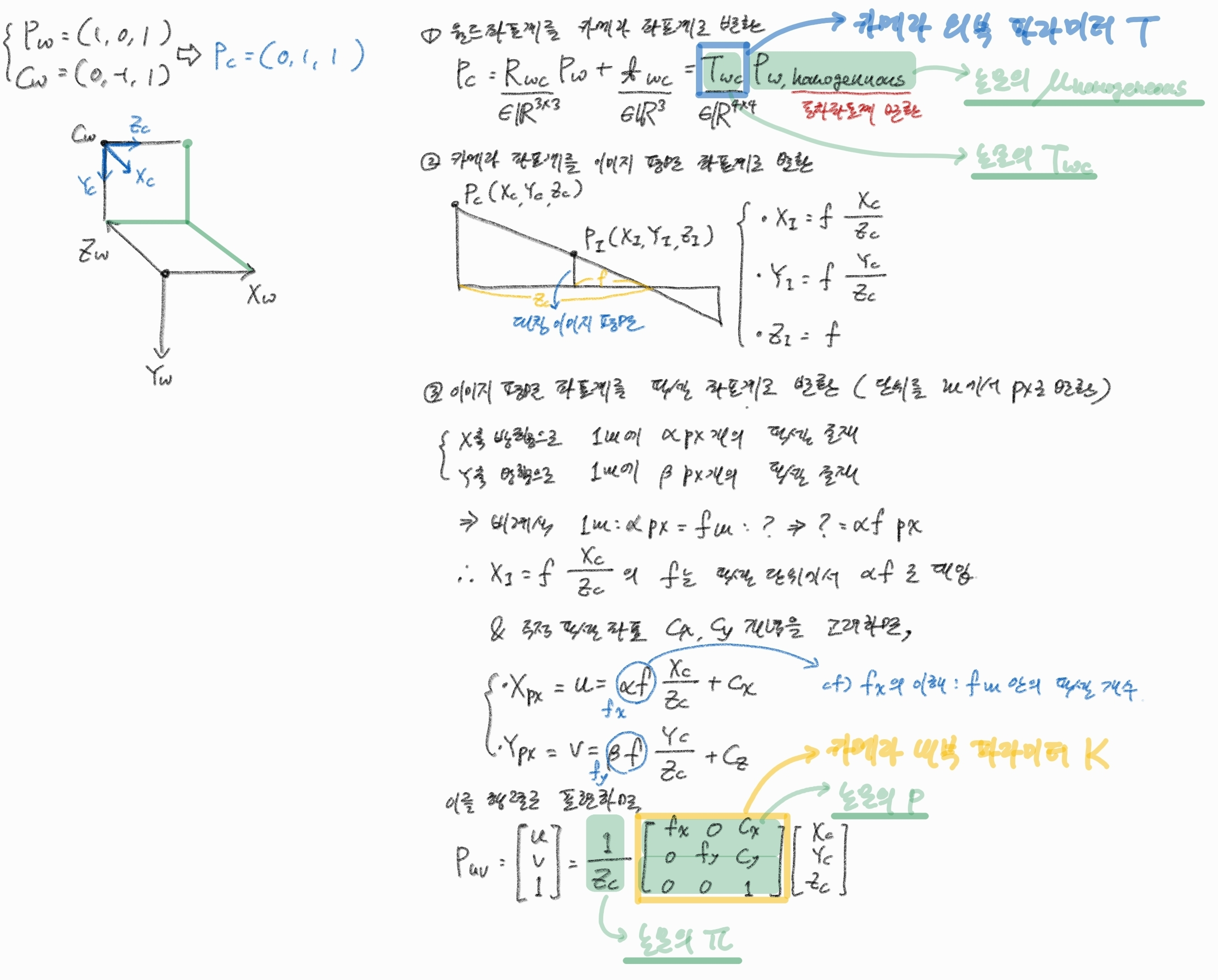 이 행렬을 곱하면 3x4 크기의 행렬이 나오며, 이를 통해 어떤 Pw값이든 이미지상의 픽셀 위치로 변환할 수 있다.