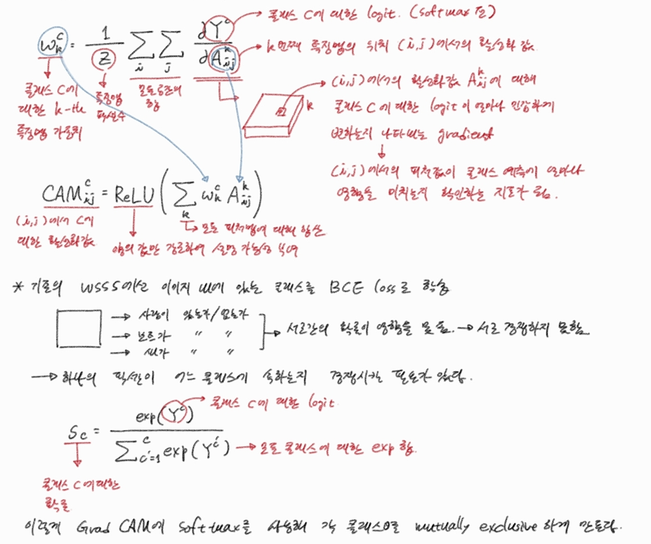 - c=c′ 항은 타겟 클래스 c가 아닌 다른 클래스 c′가 활성화될 때 타겟 클래스 c의 특징 맵 가중치(wkc)를 억제하는 효과를 가집니다. 이는 클래스 간의 상호 배타성(mutually exclusive)을 강화하여, CAM이 특정 타겟 클래스에 더 집중하고 배경 및 관련 없는 객체를 효과적으로 억제하도록 돕습니다.