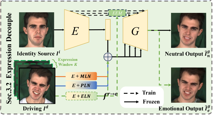 Emotion Enhancement Module (EEM)이 감정 표현 특징 fr→e를 보조적으로 활용하며, 이는 감정 토킹 헤드 생성 시에만 사용된다.