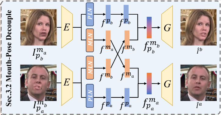 - 이 논문의 핵심 목표는 입술, 포즈, 표정과 같은 얼굴 움직임의 각 구성 요소를 독립적으로 제어하는 것이다. fp→r는 이러한 요소들이 섞여 있을 수 있으므로, 이를 그대로 사용하면 독립적인 제어가 어렵다.
