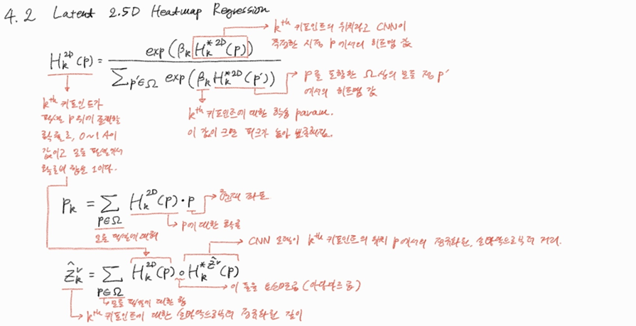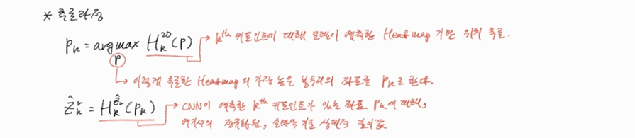 이러한 문제점을 해결하기 위해, CNN의 출력(2K 채널)을 바로 Heatmap으로 사용하지 않고 "잠재 변수(latent variables)"인 H2Dk∗ (2D heatmaps)와 Hz^rk∗ (depth maps)로 간주합니다.