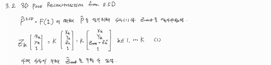 목표: RGB 이미지(I)로부터 예측된 2.5D 포즈(P^2.5D=F(I))와 카메라 고유 파라미터(K)를 이용하여 손의 3D 포즈(P^)를 복원하는 것입니다.