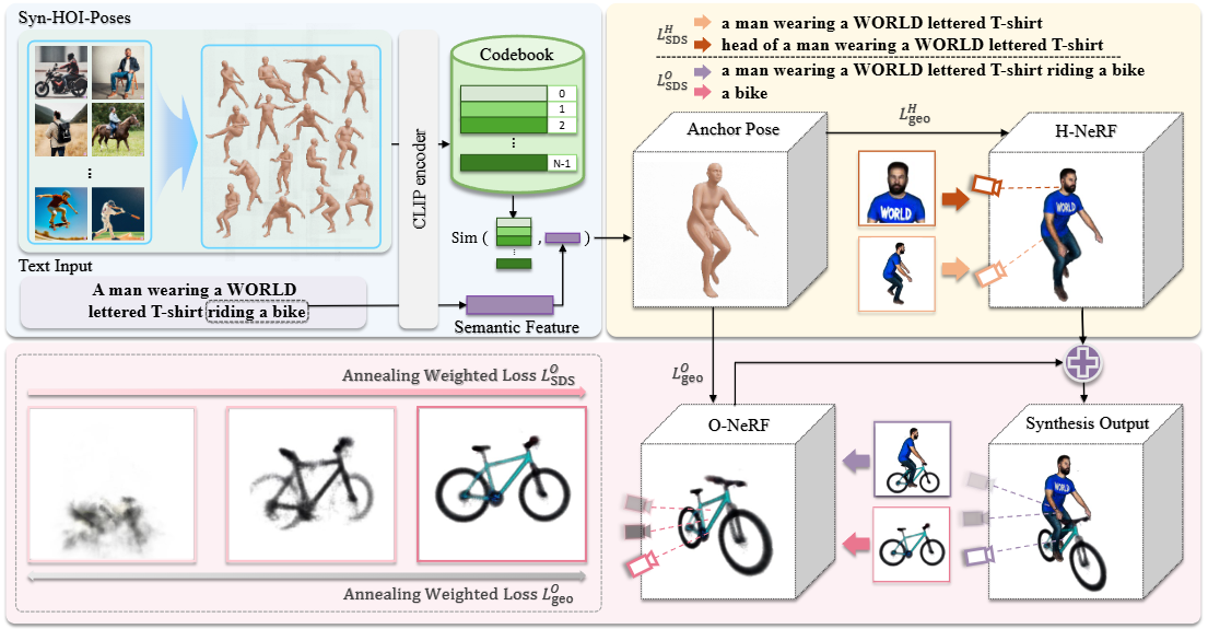 LSDS_O (Score Distillation Sampling for Object) 손실 함수를 통해 상호작용 유형(예: riding a bike)과 객체 스타일(예: a bike)에 맞춰 객체를 생성합니다.