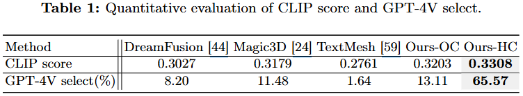 설명: GPT-4V select는 GPT-4V GPT-4V라는 강력한 시각 언어 모델이 여러 방법으로 생성된 결과물 중에서 "가장 3D적으로 타당한"(예: 완전한 인체, 완전한 객체, 정확한 물리적 상호작용) 결과물을 선택한 비율을 나타냅니다.