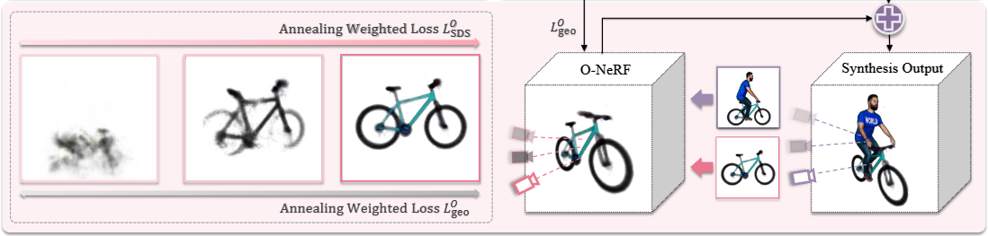 여기서 LOSDS는 객체 모델(O-NeRF) 생성을 안내하는 SDS 손실입니다. 이 손실은 다음 수식으로 표현됩니다: ∇ψOLSDS=Et,ϵ[w(t)(ϵ^ϕ(xtI;yI,t)−ϵ)∂ψO∂xI]+Et,ϵ[w(t)(ϵ^ϕ(xtO;yO,t)−ϵ)∂ψO∂xO] (Eq. 5)