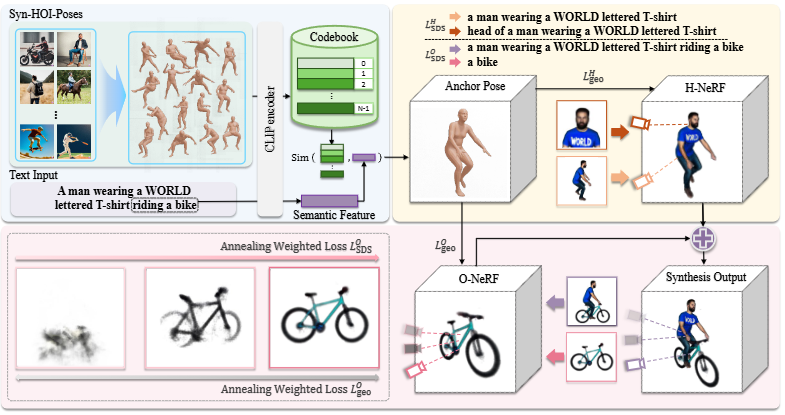 LOgeo: 객체 모델(O-NeRF)의 기하학적 제약 손실입니다. Equation (7)에 자세히 설명되어 있으며, 객체 모델이 앵커 포즈(인간의 몸) 내부의 공간을 점유하는 것을 방지하여 인간과 객체 모델 간의 물리적 충돌을 막고 겹침이 없도록 합니다.