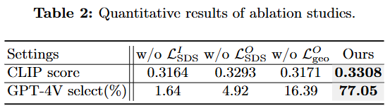 w/o LSDSO: 객체 시멘틱 가이던스 손실(LSDSO)을 제거했을 때의 성능을 나타냅니다. 이 손실은 객체 모델 생성을 객체 스타일에 대한 텍스트 설명에 맞춰 유도합니다.