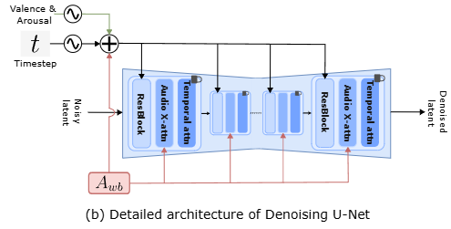 Ev: 현재 프레임의 valence 값을 sinusoidal embedding으로 인코딩한 벡터이다. 이 벡터가 timestep embedding에 추가되어 모델이 valence 정보에 따라 감정 표현을 조절하도록 한다.
