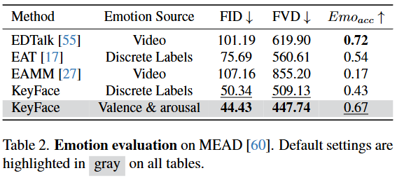 KeyFace: 본 논문에서 제안하는 모델이다. 이산적인 감정 레이블(Discrete Labels)을 사용했을 때와 연속적인 감정 표현(Valence & Arousal)을 사용했을 때의 두 가지 설정으로 평가되었다.