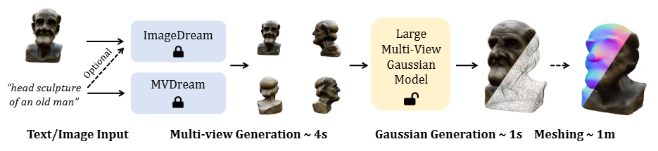 위 이미지는 LGM (Large Multi-View Gaussian Model)의 전체 3D 콘텐츠 생성 파이프라인을 보여줍니다. 텍스트 프롬프트나 단일 이미지 입력부터 고해상도 3D Gaussian을 생성하고, 선택적으로 메시(mesh)로 변환하는 과정을 단계별로 설명합니다.