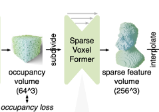 VoxelFormer: 초기 단계에서 사용되며, 3D 컨볼루션(3D Convolution)을 사용하여 의 낮은 해상도인 점유 볼륨(occupancy volume)을 예측합니다. 이 볼륨은 객체 표면에 가까운 복셀을 식별합니다.