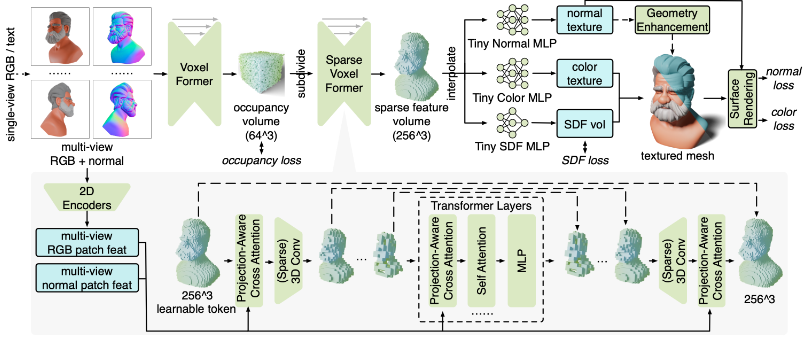 MeshFormer는 3D 컬러 텍스처 외에 추가적으로 normal texture를 학습합니다.