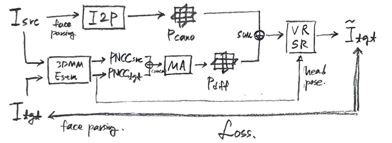원본 이미지 Isrc와 입력 모션 조건 PNCCdrv, 카메라 포즈 cam이 주어졌을 때, 최종 애니메이션된 이미지 Idrv는 다음과 같이 표현된다. (그림의 tgt를 drv와 동일한 의미로, headpose를 cam과 동일한 의미로 이해하면 된다.)