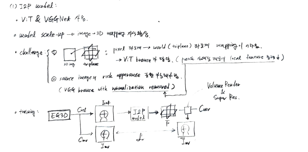 - 목적: 단일 입력 이미지에서 3D 아바타의 정규(canonical) Tri-plane 표현을 재구성하는 모델이다. 이 모델은 I2P 모델의 사전 학습 단계에서 3D GAN인 EG3D로부터 3D 사전 지식(prior knowledge)을 주입받아 얼굴 재구성 능력을 향상하였다.