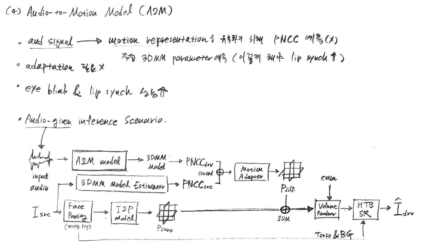 - (4) audio-to-motion model: 드라이빙 비디오 뿐만 아니라 오디오로부터 자연스러운 토킹 헤드를 생성하는 방법 제안 (이 방법은 사실 GeneFace의 WaveNet Encoder & Decoder 네트워크를 거의 모방한 것)