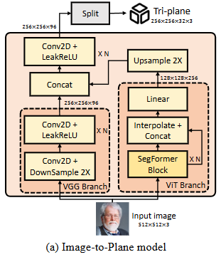 - 특징 융합: 두 브랜치의 출력 특징 맵(256×256×96 및 128×128×256)은 Concatenate 연산을 통해 융합되고, 이후 추가적인 Conv2D 및 LeakReLU 레이어를 거쳐 Tri-plane을 생성한다. Upsample 2X 연산은 해상도를 맞추는 역할을 한다.