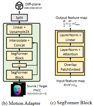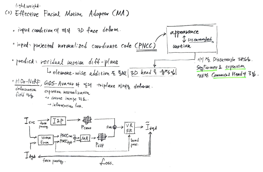 - 목적: I2P 모델로 재구성된 정규 Tri-plane에 표정(expression)과 움직임(motion) 조건을 주입하여, 원하는 얼굴 애니메이션을 구현하는 경량 모델이다. 이 모델은 PNCC를 기반으로 Tri-plane의 기하학적 변화를 최소한으로 편집하는 residual motion diff-plane을 예측한다.