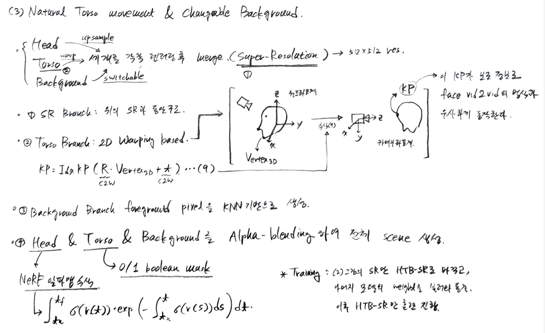 - (3) natural torso movement & switchable background: 얼굴의 3DMM 좌표계를 카메라 좌표계로 변환한 뒤, 이것의 움직임을 기반으로 torso 이미지가 워핑되어 자연스럽게 머리를 따라가는 움직임을 생성. 또한 인물이 가리고 있는 배경을 KNN 기반으로 인페인팅하여 자연스러운 배경 생성 및 교체까지 가능.
