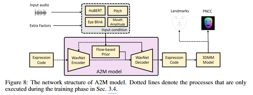 훈련 과정의 목표는 입력 오디오와 추가 요인으로부터 정확하고 표현력 있는 3DMM 표정 코드(e)를 예측하는 A2M 모델을 학습하는 것이다. A2M 모델은 Flow-enhanced VAE (Variational Auto-Encoder) 구조를 따른다.