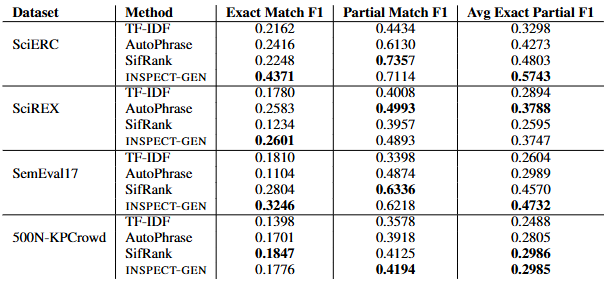 - 표는 네 개의 데이터셋(SciERC, SciREX, SemEval17, 500N-KPCrowd)에 대해 네 가지 방법(TF-IDF, AutoPhrase, SifRank, INSPECT-GEN)의 keyphrase 추출 성능을 Exact Match F1, Partial Match F1, 그리고 이 두 값을 평균한 Avg Exact Partial F1로 비교.