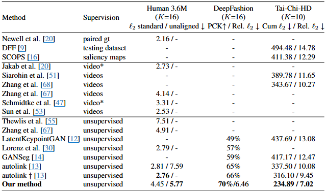 다양한 휴먼 포즈 데이터셋(Human 3.6M, DeepFashion, Tai-Chi-HD)에서 여러 키포인트 추정 방법들의 성능을 비교한 표입니다. 각 행은 다른 방법을 나타내고, 각 열은 사용된 데이터셋, 방법의 학습 방식(Supervision), 그리고 해당 데이터셋에 대한 평가 지표를 보여줍니다.