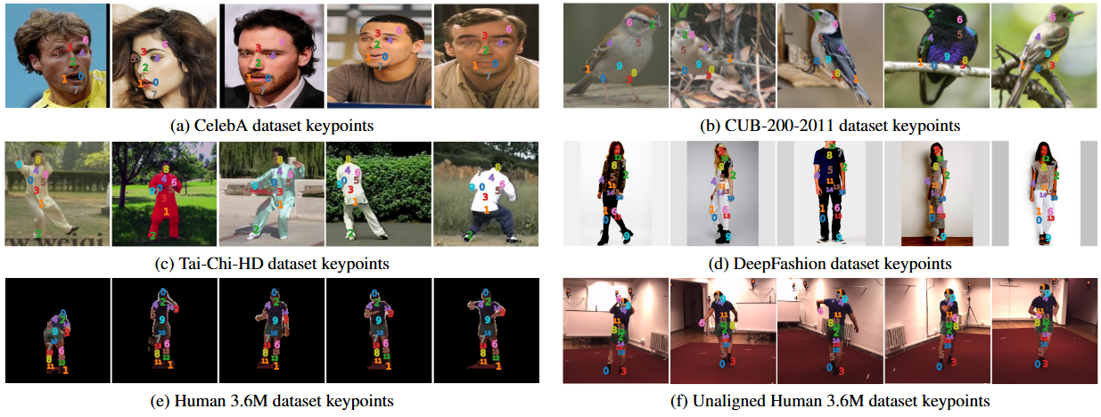 주요 시사점: 이 그림은 이미지의 외형 변화(자세, 의상, 배경 등)에도 불구하고 본 논문의 방법이 데이터셋 내에서 의미적으로 일관된 위치에 키포인트를 잘 찾아내는 것을 보여줍니다. 특히 Tai-Chi-HD와 같이 도전적인 데이터셋이나 정렬되지 않은(unaligned) Human 3.6M 데이터셋에서도 안정적인 키포인트를 추출하는 것은 제안된 방법의 강점을 잘 드러냅니다.