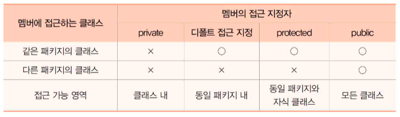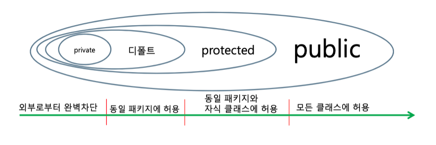 - 필드나 메소드 앞에 붙어 다른 클래스의 접근 허용을 표시