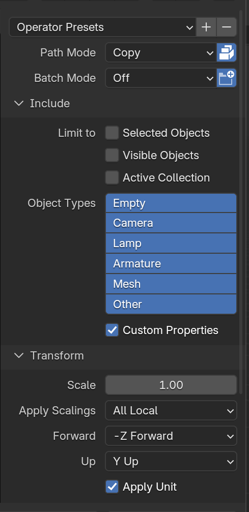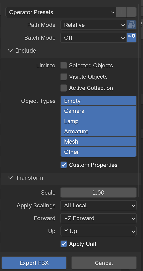 설정이 아주 많은데, 현재 fbx texture 공부에서는 이 두 가지를 자세히 보면 됩니다.