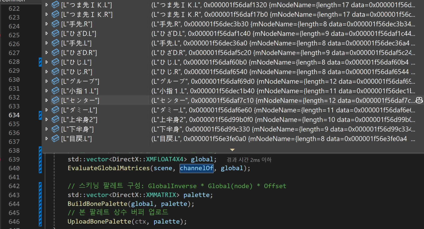 // 스키닝 팔레트 구성: GlobalInverse * Global(node) * Offset