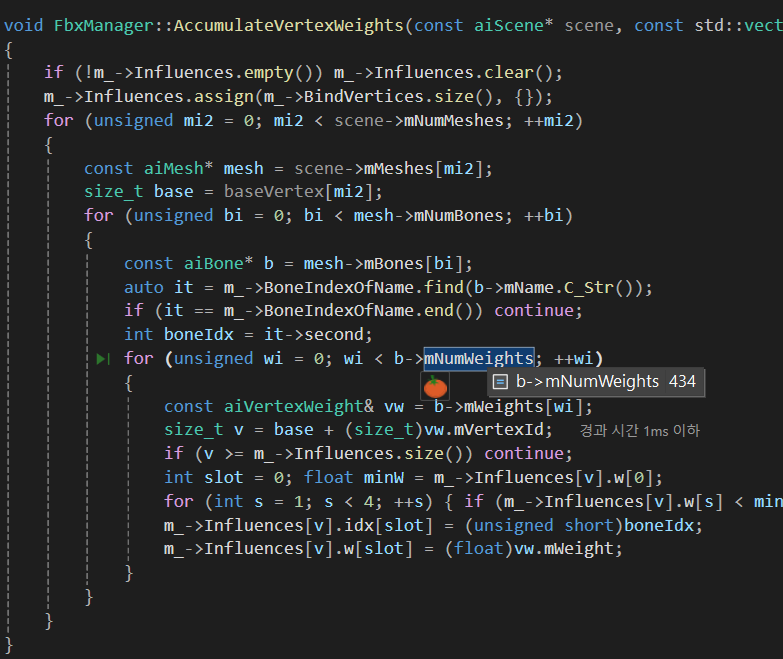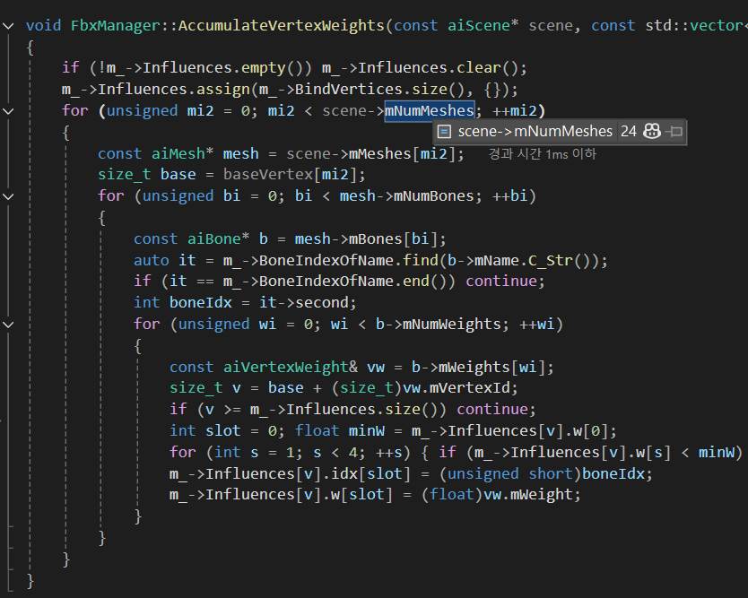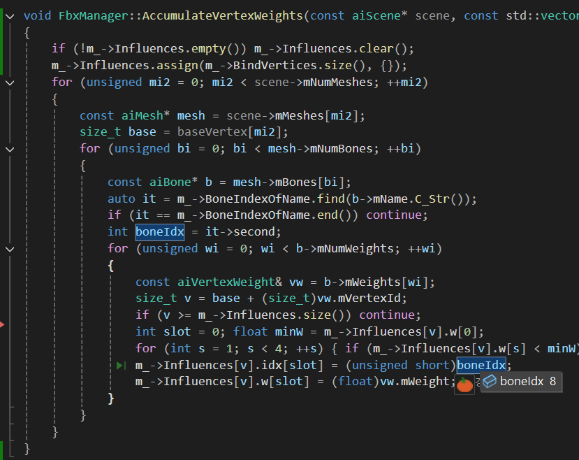 각 본의 aiVertexWeight를 VB 인덱스로 변환해 버텍스별 영향받은 상위 4개만 저장합니다.