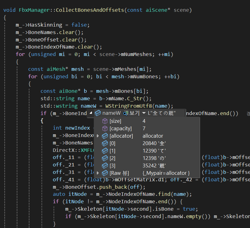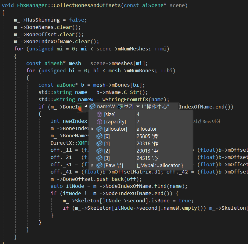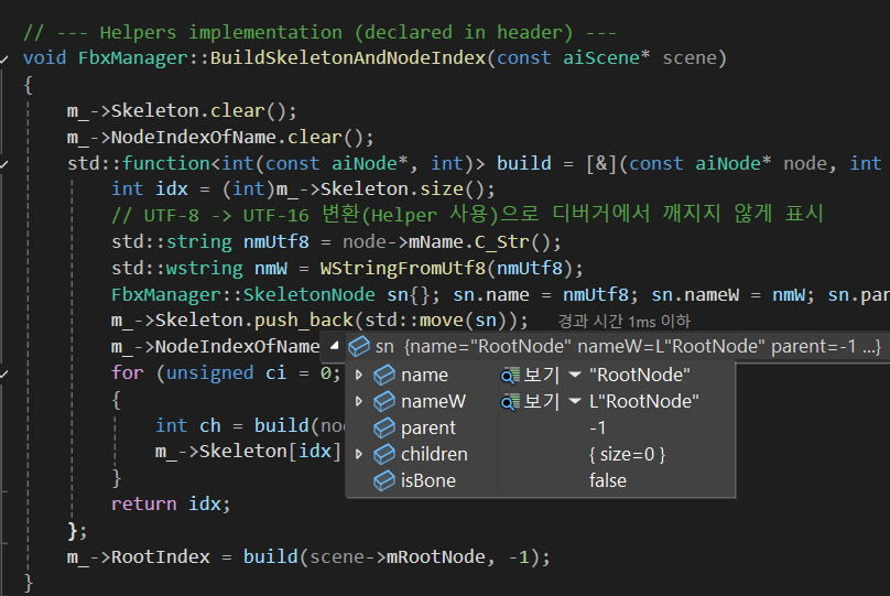 // UTF-8 -> UTF-16 변환(Helper 사용)으로 디버거에서 깨지지 않게 표시