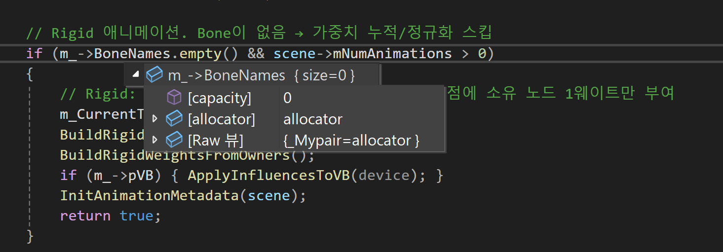 // Skinned 애니메이션. 본이 있음. → 가중치 누적/정규화 수행