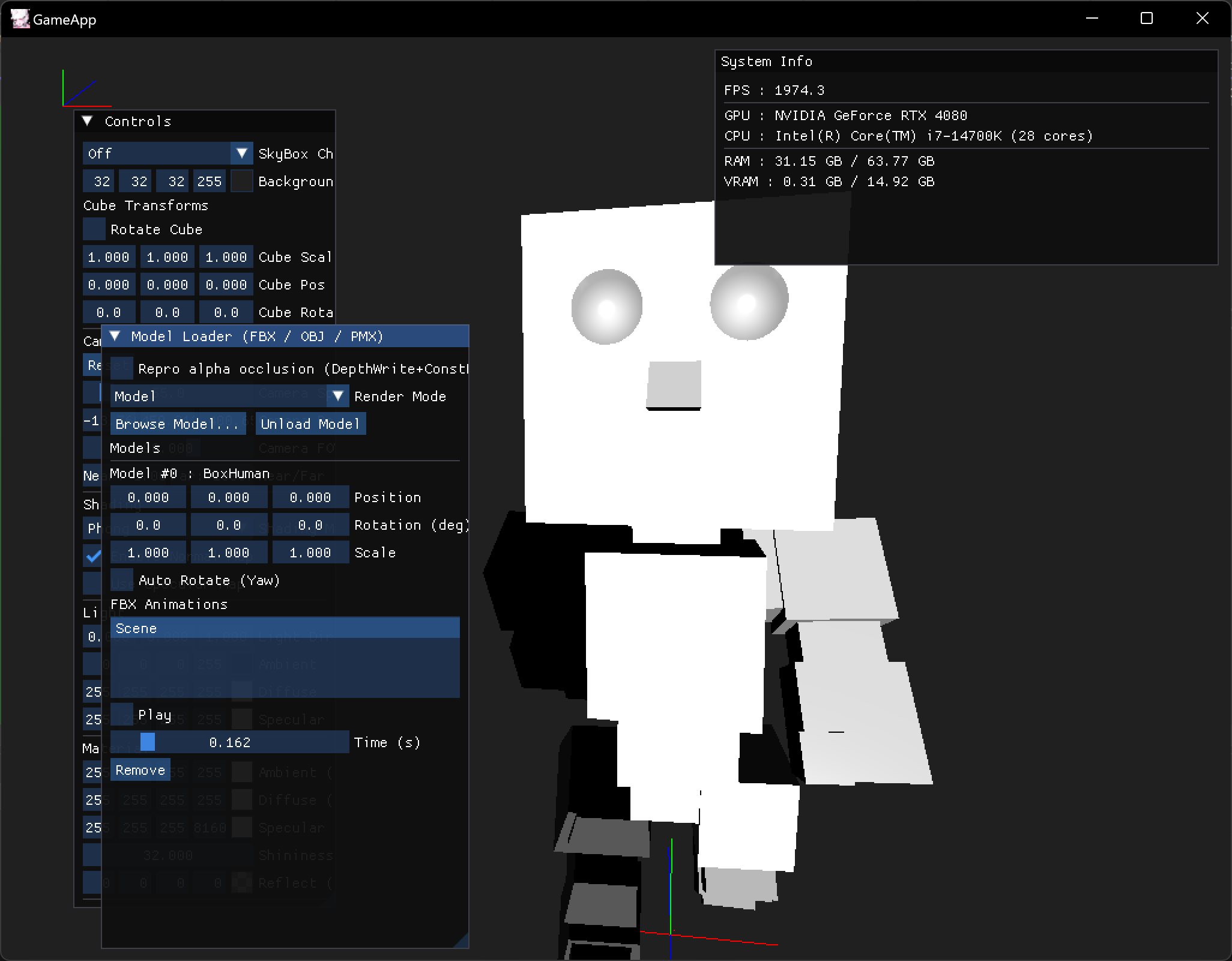 3D 모델이 완벽하게 그려졌고, Skinned 가중치 적용 애니메이션을 구현했다는 걸 전제로 진행합니다.
