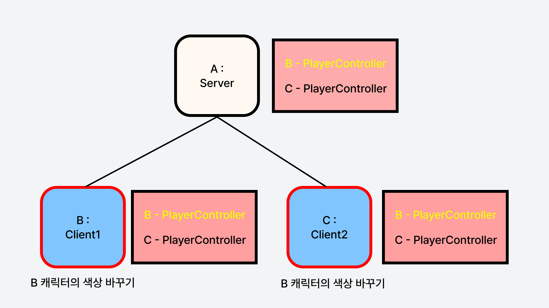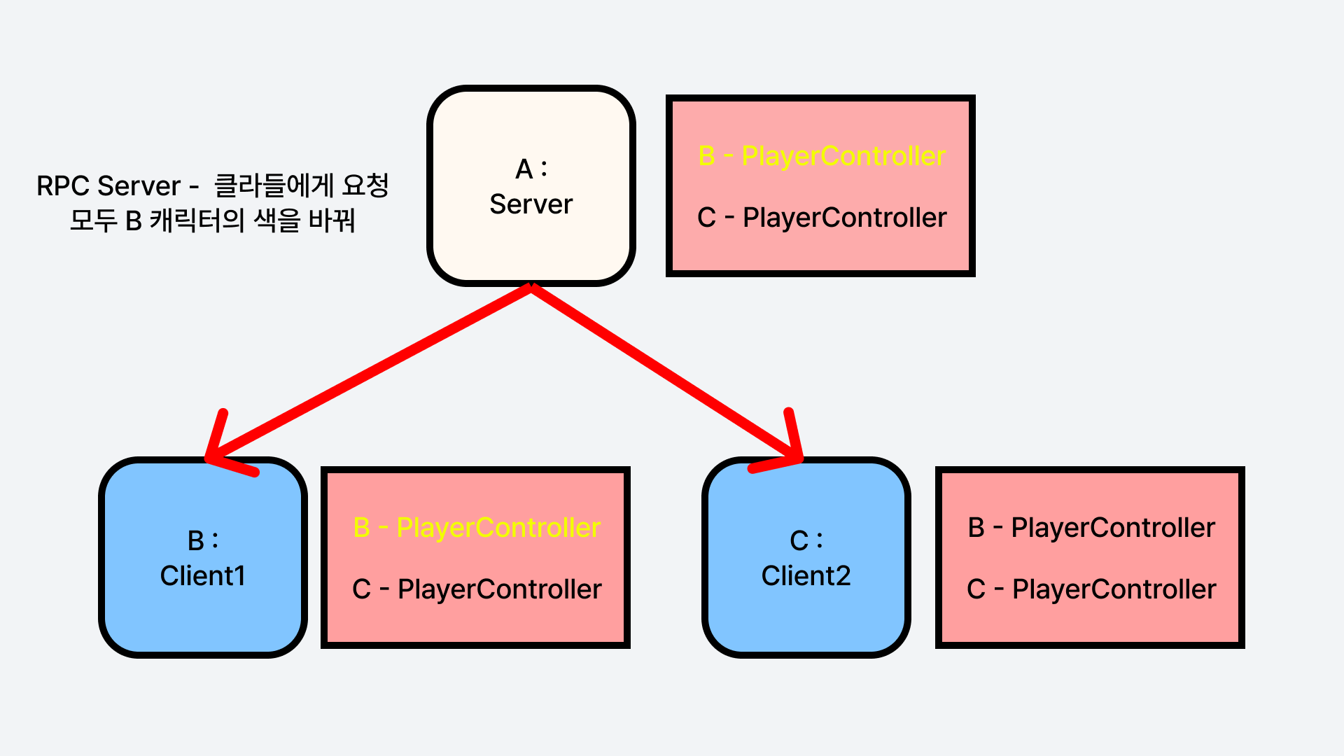 💡여기서 생각해 볼만한 문제입니다. A에서 B,C에게 색상을 바꾸라는 명령을 내릴때 다음처럼 코드를 작성 할 수 있습니다. 매개변수인 Character는 요청한 B의 캐릭터이고 Color는 색상입니다. 지금 코드는 B 클라에서 B 캐릭터의 색상만 바뀝니다. C 클라에서는 B 캐릭터의 색상이 바뀌지 않습니다. 왜 그럴까요? RPC의 개념을 잘 공부했다면 뭐가 문제인지 금방 알 수 있습니다. A 서버에 있는 B, C 캐릭터는 C클라에 있는 B, C 캐릭터와 그 오브젝트 정보가 같지 않습니다. 서로 다른 pc의 프로세스에서 메모리를 할당받아 만들어진 오브젝트이기 때문입니다. 이를 어떻게 해결할지는 잘 생각해보시기 바랍니다.